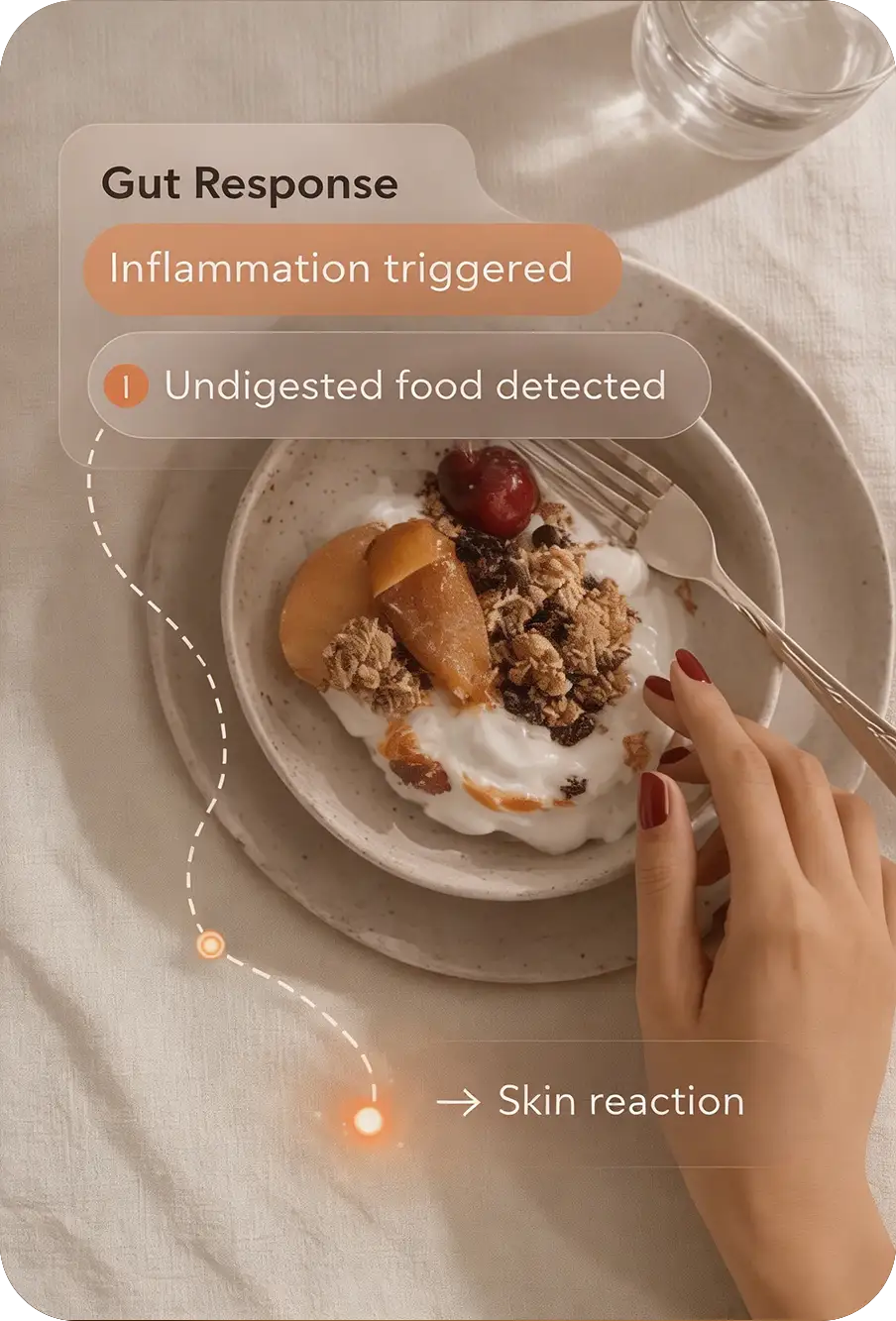 Your gut lining develops tiny cracks that were never supposed to be there. Undigested food slips into your bloodstream like an intruder through a broken lock. Your body panics and sounds the inflammatory alarm. Your face takes every single hit.